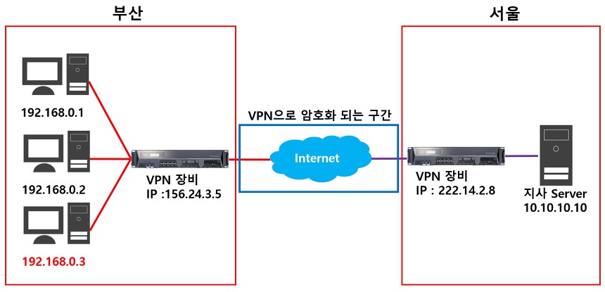 위 그림을 참조하면 서울과 부산 각각 VPN장비 1대씩 설치한 모습을 볼 수 있다.