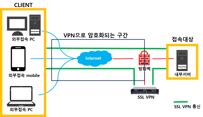그 이유는 웹 페이지 등을 통해 사용자의 인증이 완료되면 VPN을 사용할 수 있는 가상 IP주소가 할당되기 때문에 장소나 단말의 종류와 관계없이 내부 네트워크에 접근이 가능하다.