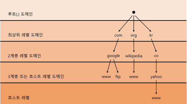 구글을 예로 들면 www.google.co.kr 이므로, 최하위 레벨 www, 2계층 레벨 google, co, 최상위 레벨 kr을 조합하였다.